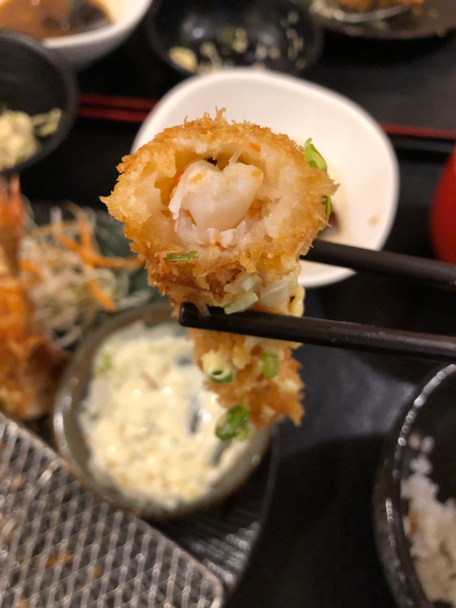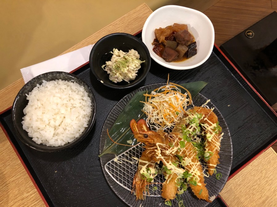 以台北市的商業午餐來說,價格不高,炸豬排的外皮風味不錯,但不知為何肉嚼起來聯想到厚紙板,炸蝦也還可以。